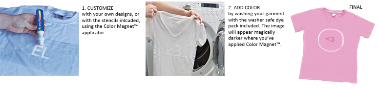 Easily customize garments with Color Magnet™ Dye Kits using the Color Magnet™ Pen and stencils (included). After Color Magnet™ dries, simply wash the garment along with the dissolvable, washer-safe dye packet in your washing machine. A darker shade of the dye will appear where Color Magnet™ was applied. Rubber bands are included for optional tie dye effects.
